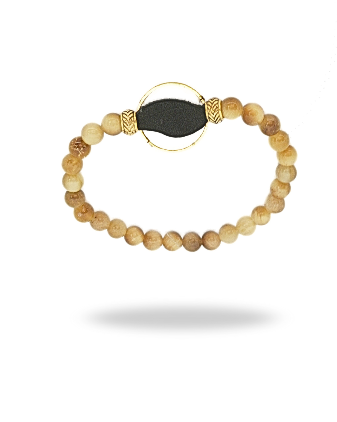 Ce bracelet est composé de perles en œil de tigre de 6 mm, aux reflets chauds et naturels. Un cercle doré placé au centre accueille une vague de cuir noir, apportant une touche sobre et moderne à l’ensemble.