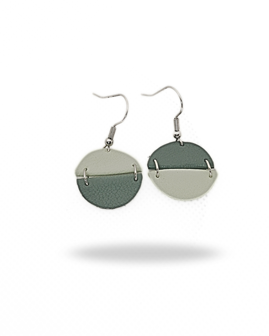 Boucles d’oreilles modernes composées de deux demi-cercles en cuir recyclé, reliés par des anneaux en acier inoxydable. Un design graphique et polyvalent, parfait pour illuminer vos tenues de tous les jours.